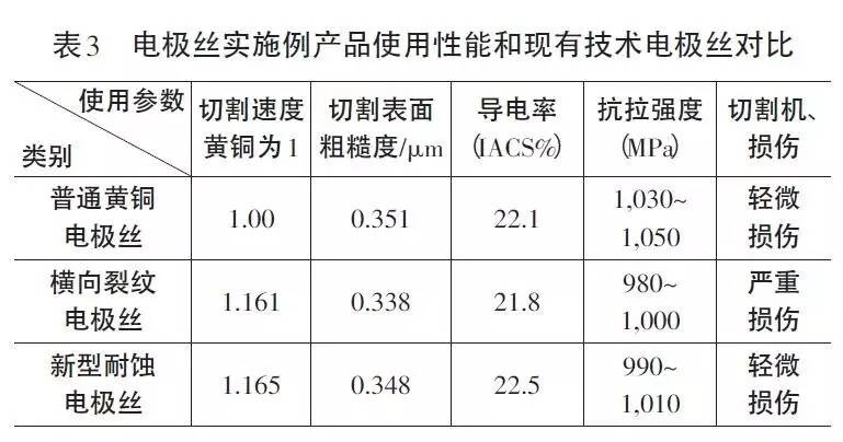 (1)新型耐蝕電極絲的芯材金屬因?yàn)椴捎昧撕辖鸹倪B續(xù)熔煉鑄造技術(shù),通過添加M1和M2兩種不同類型的金屬元素,使材料的綜合性能得到提高,M1中磷、稀土、鈉、鉀、鎂、鈣為強(qiáng)的還原性金屬,且化學(xué)性能都比銅和鋅活潑,這些元素添加后,可以同銅鋅溶液中的雜質(zhì)元素發(fā)生氧化還原反應(yīng),去除這些雜質(zhì),因?yàn)檫@些元素的化學(xué)反應(yīng)生產(chǎn)的產(chǎn)物比銅溶液的密度低,雜質(zhì)漂浮在溶液表面,便于清理,M2中鋁、硅、錳、鈦、鉻、鐵為強(qiáng)化元素,電極絲是表層縱向裂紋的存在降低了材料的力學(xué)性能,為了不使材料的強(qiáng)度降低,添加M2中的任何一種金屬元素,這些金屬元素同銅鋅固溶在一體,提高基體的強(qiáng)度,芯材的抗拉強(qiáng)度得到了提升,強(qiáng)度的提高有助于在切割時(shí)提升切割工件的直線度。